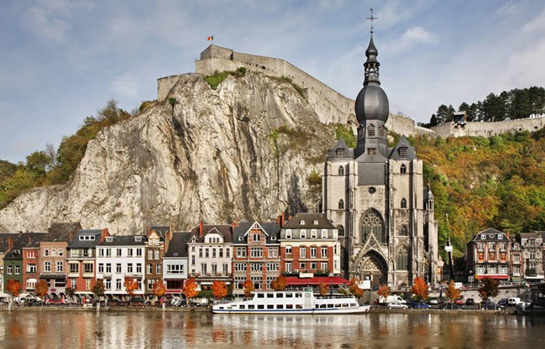 Η μικροσκοπική πόλη Ντινάντ βρίσκεται φωλιασμένη ανάμεσα στον ποταμό Meuse και τα ψηλά βράχια που ξεπροβάλλουν από πίσω.
